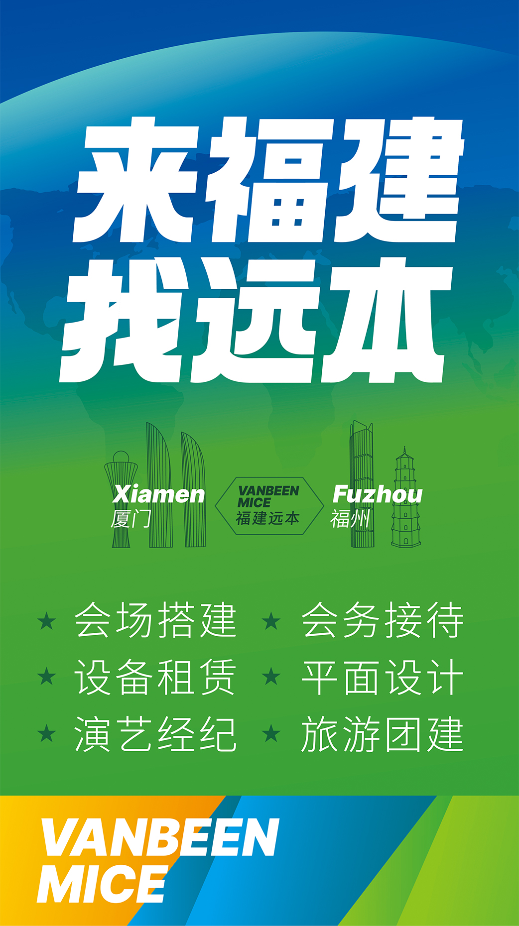 廈門遠本成立于2013年,是一家集策劃設計、落地搭建以及會議接待等全案服務的DMC公司。公司擁有LED屏幕、燈光音響、木作工廠等專業舞美設備,擁有一批專業穩定的策劃設計和會務接待團隊,能夠快速、精準地為客戶提供優質的策劃、設計、搭建、接待等服務。公司已服務過華為、阿里、麥當勞、中國移動、埃克森美孚、興業銀行、招商銀行、華潤三九、齊魯制藥、萬邦制藥等國內外知名企業,并成功入選中國國旅、中旅、康輝國旅、錦江國旅、中智商展、墨馬傳媒等國內知名PCO公司供應商庫。